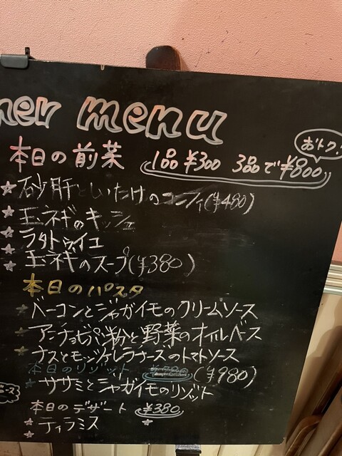 前菜盛り合わせ ・砂肝としいたけのコンフィ ・玉ネギのキッシュ ・ラタトゥイユ ・玉ネギのスープ ・鶏レバーのパテ(たぶん…) ・生ハム