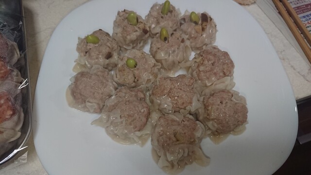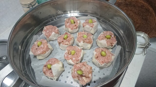 問題がシウマイ。家にあった豚肉に玉葱を入れて成形したのだが何を思ったのか肉と皮のバランスを考えてしまい大きさを無視。出来上がったシウマイ大きいじゃん(><)
