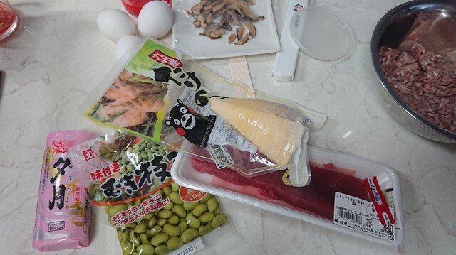 鮪の柵、昆布の佃煮、鶏肉、かまぼこ、シウマイの皮などを買い込む。