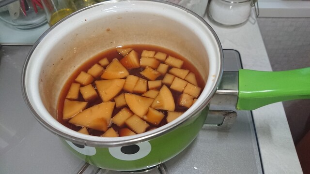 まずは筍、同じ大きさに切って鍋で煮込む。甘さと醤油の塩梅が難しい。