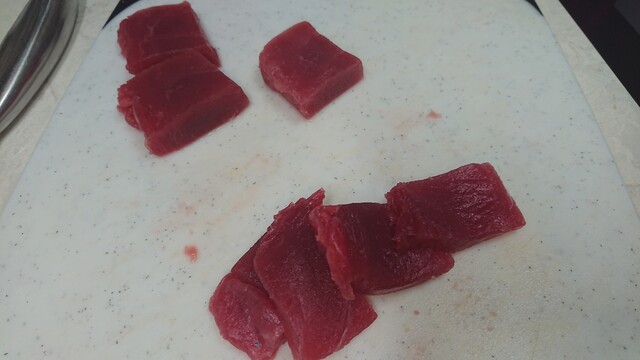 鮪は何種類かの厚みに切り分けて醤油と酒で漬け込み網焼き。焦げ目も再現。
