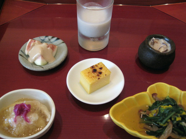 八寸 玉子カステラ 無花果のゴマだれ、ワタリガニの土佐酢ジュレ