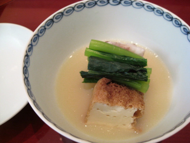 焚き合せ 厚揚げ、ぐじ、小松菜(?)の白味噌仕立て
