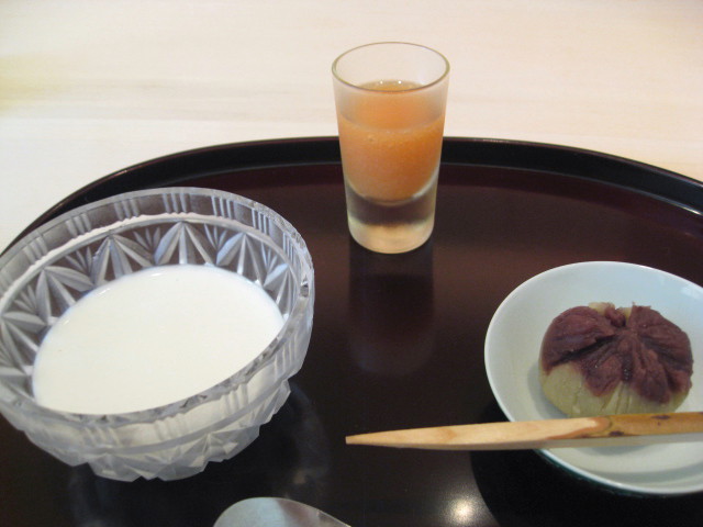 水菓子 紫芋の茶巾絞り、ジャスミンのブラマンジェ、ネクター