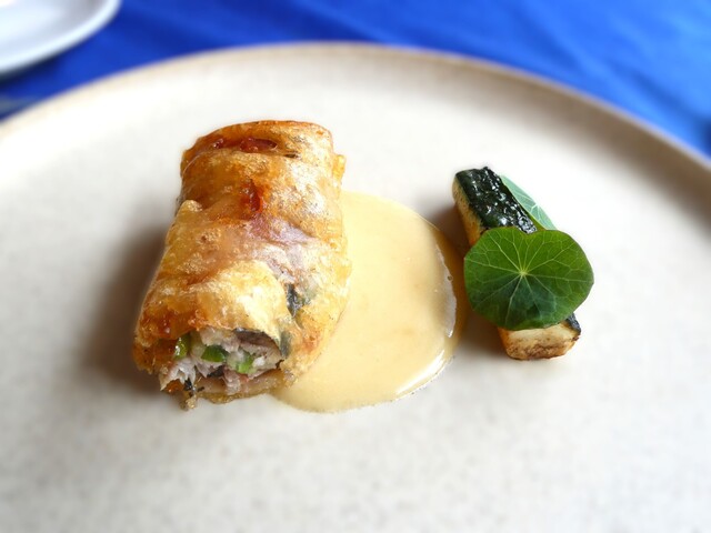 巻いてベニエにしたもの。ソースは魚のフォンと白ワイン。