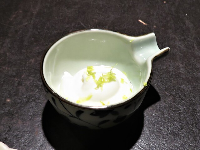 ②青海苔を練り込んだ最中 ウオゼ、長芋、酢橘のタルタル 卵黄ソース