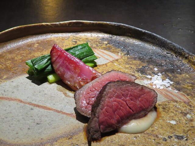 六皿 川岸牧場 神戸ビーフのロースト フランスのアスパラソバージュと淡路島の赤葱