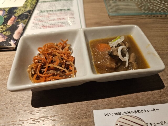 まず、お通し。ラム肉を使ったきんぴらのような物とラム肉の煮込み。お通しから手抜き感なく美味しい。
