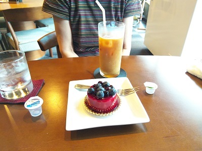 今日はブルーベリータルト(460円)にホットコーヒー(セットで100円引きの200円)そしてカシス(480円)にアイスコーヒー(セットで100円引きの200円)をいただきました。