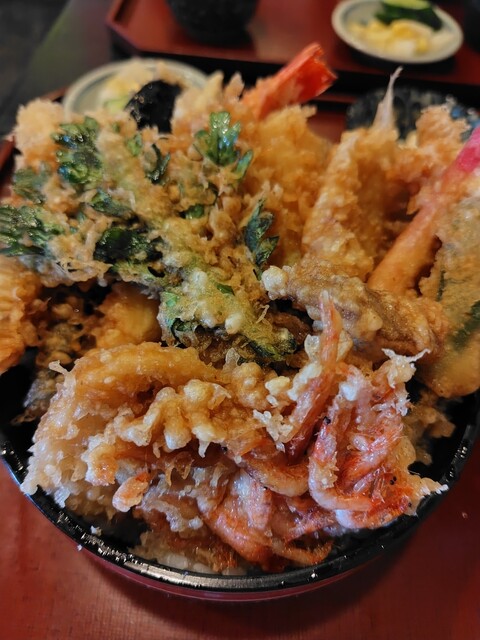 整形外科に行った帰りに再訪です。昼はとっくに過ぎていましたが、二組ほど待っていたので、15分ほど外で待ちました。その間に売店でかき揚げやメンチカツを購入しました。前回来た時に「次は桜エビのかき揚げ天丼を食べよう」と思っていたのに、コスパの良いミックス天丼を注文してしまいました。隣の席に座った方がとんかつ定食を頼んでいましたが、凄く分厚いお肉でびっくりしました。カキフライも注文していましたが、量が多いので、結局食べきれずに持ち帰り用のパックを頼んでいました。相変わらずお値段そのままでしたが、心配になるほどボリューム満点です。