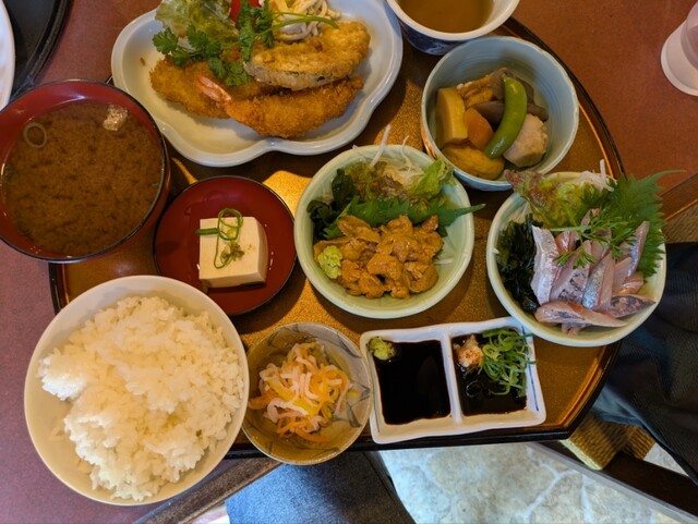 運ばれて来たものは小鉢二種、煮物、揚物、味噌汁も乗っとるやん