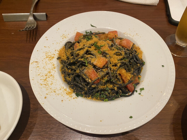 1つはカルボナーラ(ランチとディナーは違うそうですが)でもう一つはイカ墨パスタのからすみソース。