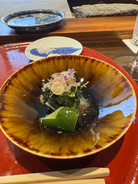 とうもろこしのすり流しから始まり、お刺身へ。そして天ぷらスタート。車海老ではなく、かますからでした。お魚中心の天ぷらで、アオリイカ、金目鯛、のどぐろ、太刀魚、鮎、鯵、豆鰯、才巻き海老でした。野菜も地物で丸茄子、オクラ、にんじん、とうもろこし、ヤングコーン、さつまいも、とかなり品数は多いです。最後に天丼、デザートは白玉ぜんざいでした。