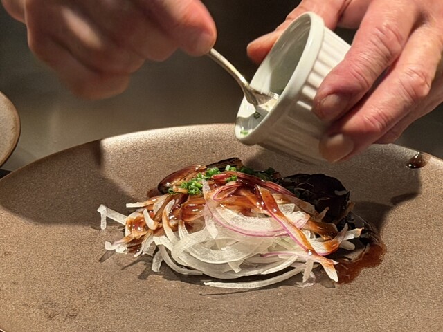 鮑も牛サーロインもマエストロに焼いていただくと、素材が何倍も美味しくなって出来上がります。加賀れんこんを添えて。