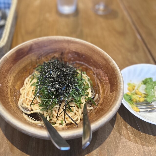 いつも「たらことイカ」に大葉トッピングをします。ハシヤ系列のパスタはいついってもいつ食べても変わらぬ美味しくて、子供のころからの幸せの味。別のお客さまは、たらことイカに納豆トッピングをしていて、今度挑戦してみようかな……