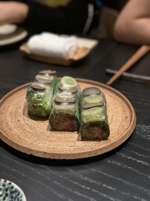ワインのエキスパートが在店しているためペアリング提供も可能。お酒の弱い方にはノンアルコールドリンクも充実し、まだ暑さが残る時期だったので、モヒート風のサワーを。八女茶のサラダや、タコスをバインセオに見立てたメニューなど新しい発見と感動の連続!最後のフォーは鶏出汁がしっかり効いたケミカルな味がしない、おいしくて優しいスープに厚切りの椎茸がお肉がわりに。どのメニューもかなり美味しかったです。