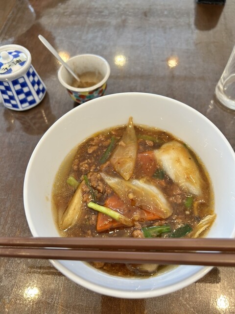 ピリ辛茄子とトマトの冷菜、もちろんトマトの皮はきちんと剥いてあるし、茄子は味がしっかりと染みている。白髪ネギやキャベツの酢漬け(?)が良いアクセントになっていた。