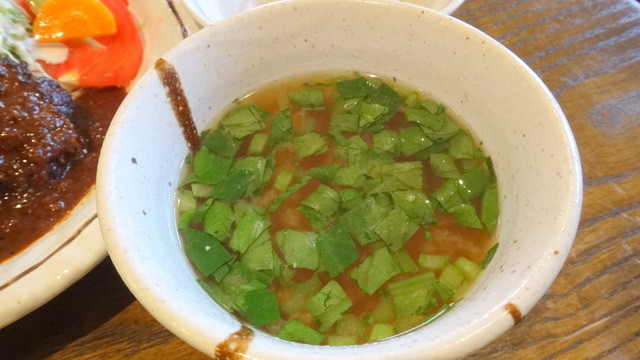ご飯とお味噌汁、ポテサラが付いてメインプレートには肉汁ジュワジュワのハンバーグ・ステーキと濃厚なコクがあるデミグラスソース。千切りキャベツとブロッコリーなど温野菜&トマトが脇を固めて申し分ないです。まずは大根菜と豆腐の素朴な味噌汁をいただいてから、ハンバーグを箸で裂いていくと、肉汁がジュワジュワーっと滲み出てきて、見るからにウマそう。