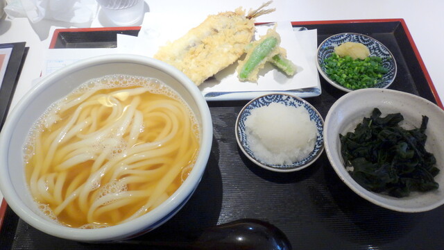 ぶっかけがオススメらしいんですが、優しい出汁を味わいたいと思いまして「かけうどん」+「イワシ天」にトッピングは「大根おろし」&「ワカメ」をオーダー!その後は「冷や」しかオーダーできなかったようなんで、ギリギリセーフでかけうどんにして良かったです。