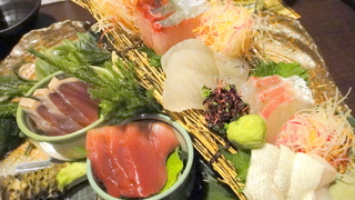 ↓こちらがこの日一番豪勢な刺身五種盛り2604円!右下から反時計周りに珍しい真鱈、マダイ、スズキ、カンパチ、日戻りカツオ、メバチマグロでございます!マダラが珍しかったんですが、鮮度抜群でまいうーでした!日戻りカツオは九州産の朝採れらしく、その日の早朝に戻ってきて水揚げしたらしいです!