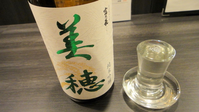 19時に潜入すると木曜夜とはいえ、ほぼ満席状態で人気店のようです。先ほどビールは飲んでしまったので、一杯目から飲んだことのない日本酒をオーダー!まずは今田酒造本店さん(東広島市)の「美穂」でカンパーーイ!「富久長」という銘柄が有名な蔵元さんですが、所長によると「美穂」は女性杜氏(蔵元!?)さんのお名前とのこと。ラッキーなことに一升瓶の最後の一杯と少しを頂きましたが、名前のせいか人気のお酒のようです。