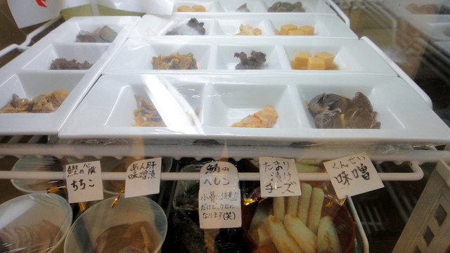 珍しい銘柄の日本酒がたくさんあったので少し迷いましたが、「赤城山」純米吟醸(60ML、250円)、「南方」(みなかた)純米吟醸(60ML、200円)、「鈿女」(うづめ)純米吟醸(60ML、200円)をチョイス。250円+200円+200円−100円なので、お会計は550円!さらにオツマミを聞くと背後の冷蔵庫にたくさん詰まっていたので、300円のサバくんせいをアテにしました。チェイサーのお水もセルフサービスで置いてありましたので、お口直ししながら利き酒します。