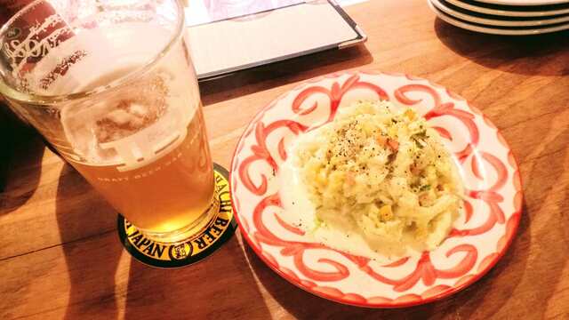 クラフトビールスタートは、京都醸造×デビルクラフトのコラボビール「三本の矢」(ハーフサイズ390円+税)でカンパーーイ!テイストは、IPAにしては意外とスッキリしていて飲みやすかったかな!?