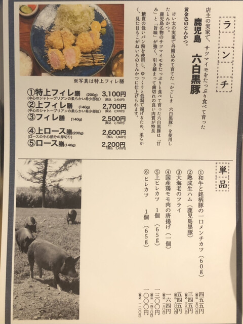 卓上にはランチメニューが置かれていますが、メニューは比較的シンプルで、とんかつは基本鹿児島産六白黒豚単品。