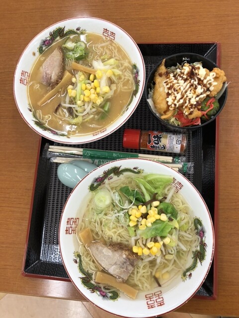 上が味噌ラーメンとミニマヨ唐丼のセットで、下が塩ラーメンです。