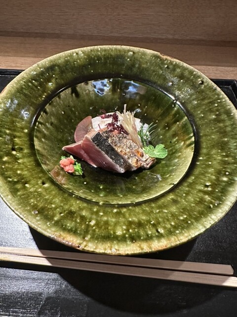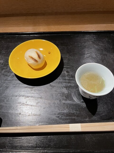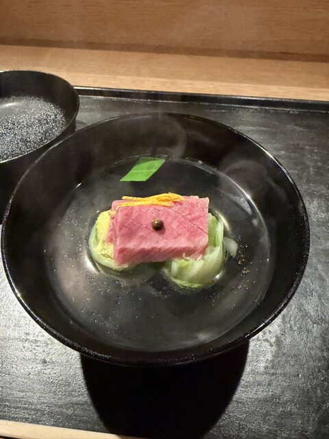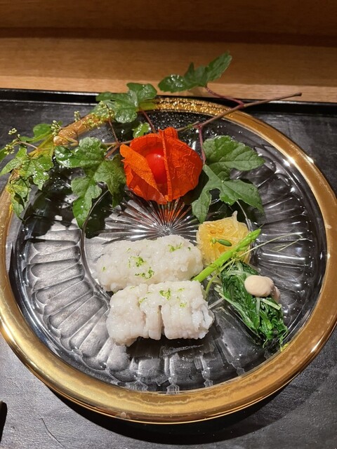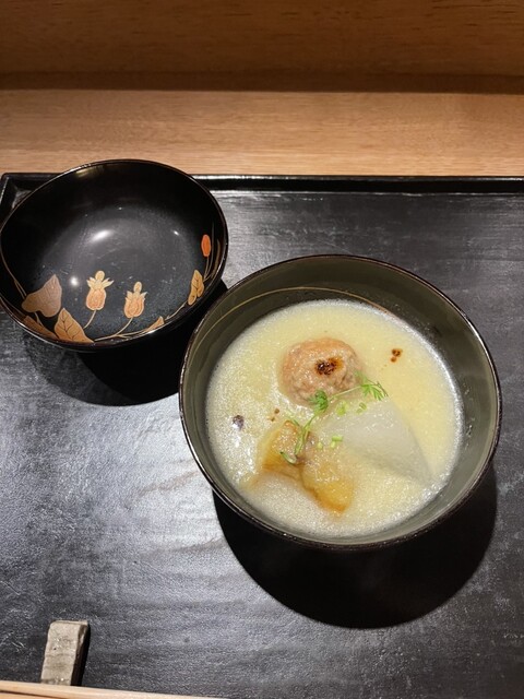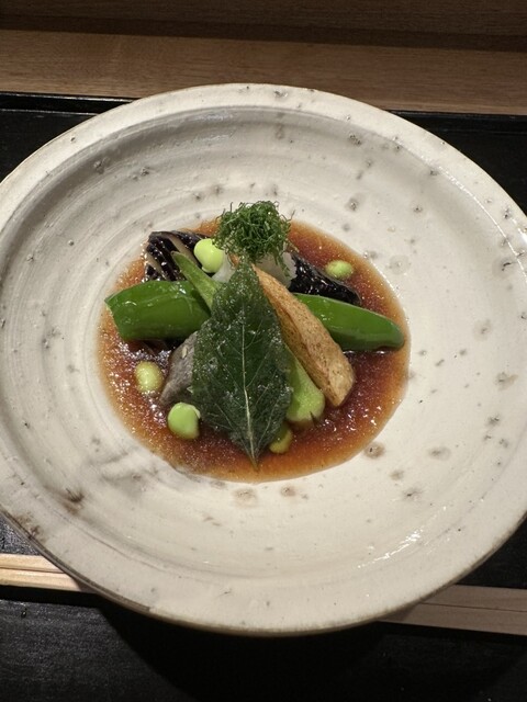木筒より 旬魚 古代ひしほ 鱧と冬瓜の澄まし椀 葛の芽 ばあく豚の当帰揚げ 生麩コロッケ 自家製ウスターソース