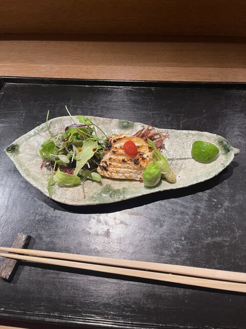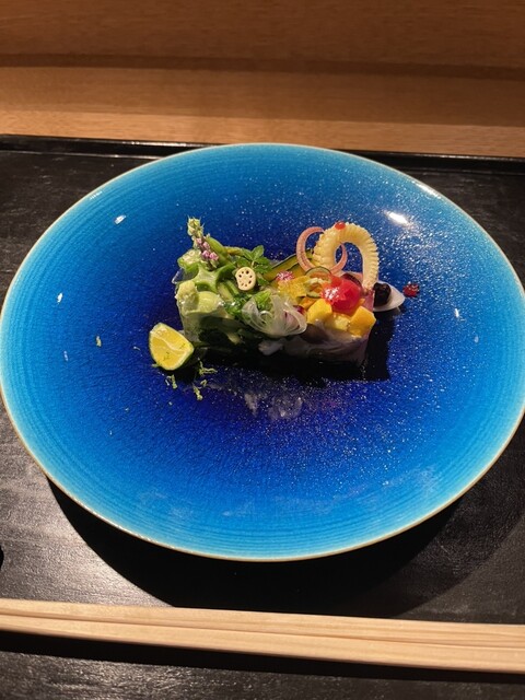 白アスパラガス、大根の桜、梅、5種類のかいトリ貝、ほっき、白ミル貝、赤貝、鮑、あおさ海苔、醤油すだち1番だしジュレがけ
