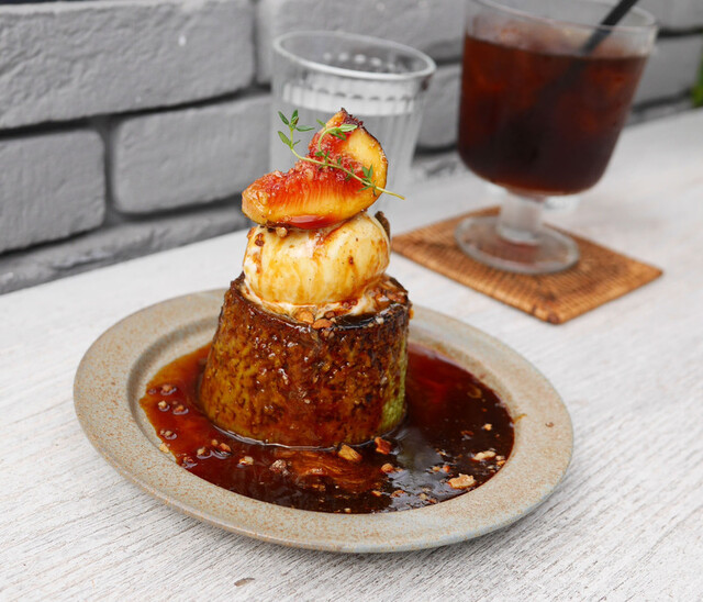 ピスタチオのプリンの上にはアイスとイチジクが乗ってます。