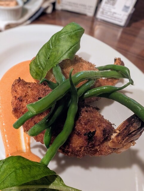 そのあとは悩んだ挙句、、鱧フライ(美味しいタルタルソースたっぷり)、アヒージョ(これは初めてかも)をいただき、ここで赤ワインを追加。カベルネソーヴィニヨンのしっかりしたタイプです。