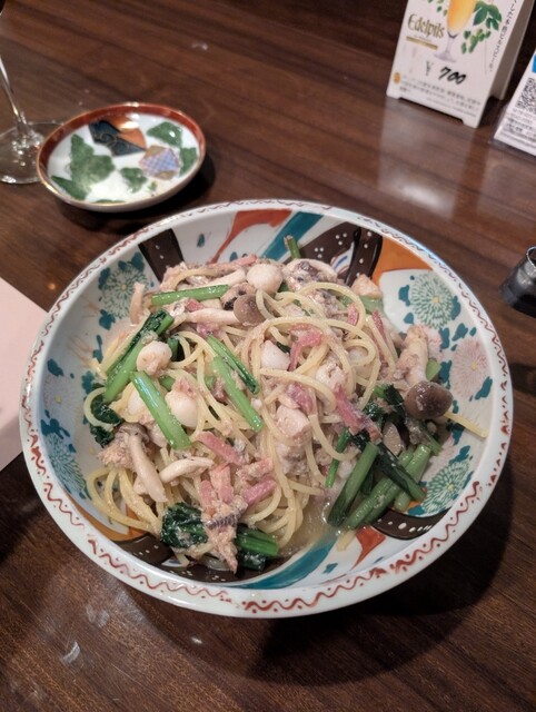 小柱やオイルサーディン、きのこ類もたっぷりの具沢山オイルパスタをいただきました。