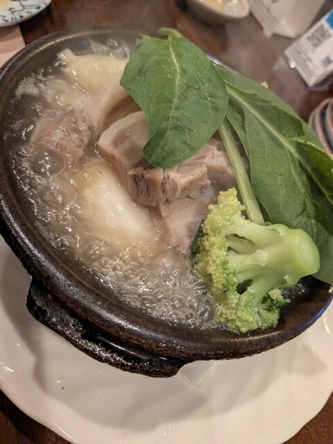 土鍋でぐつぐつ、豚バラの大き目の塊が入っています。
