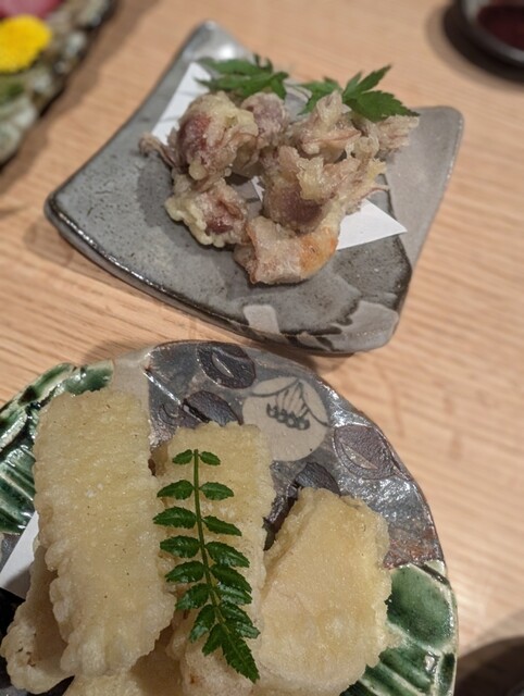 お造りから始めて、まずは春なので筍の天ぷらやホタルイカの天ぷらなど。