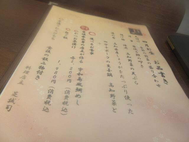 内容は・前菜盛り合わせ・カツオのタタキ・高知野菜の天ぷら・四万十ポークのショウガ鍋・選べるごはん・食後の飲み物・デザート(わらびもち)。