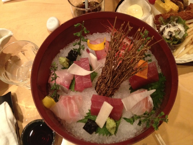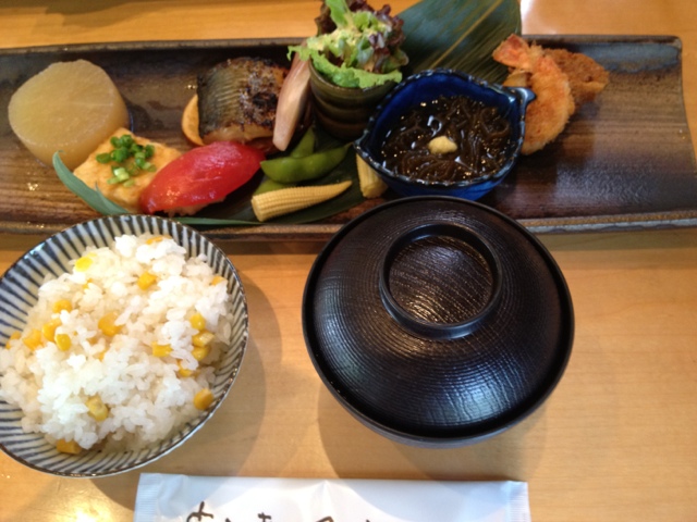 お刺身盛り合わせは大きな器にたっぷりの氷が入っていて、その上に盛り合わせてあります。飛騨牛御膳はお肉が柔らかく、リンゴのソースがとても合います。