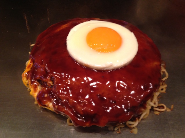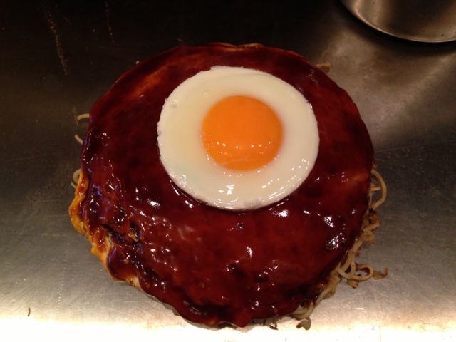 まん丸なお好み焼きの上に、まん丸な目玉焼きが乗ると、ちょっぴり嬉しい。