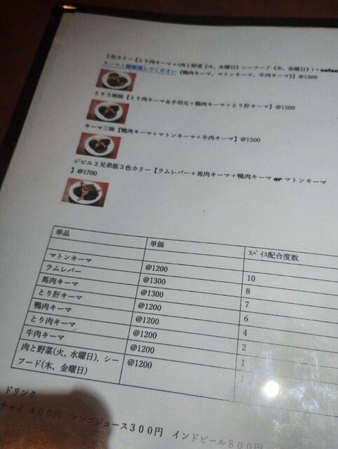 カレー1種類のみだと¥1200〜、3種のあいがけだと¥1500〜のようです。値段を考えると、個人的には色々楽しめるあいがけ一択でしょうか。