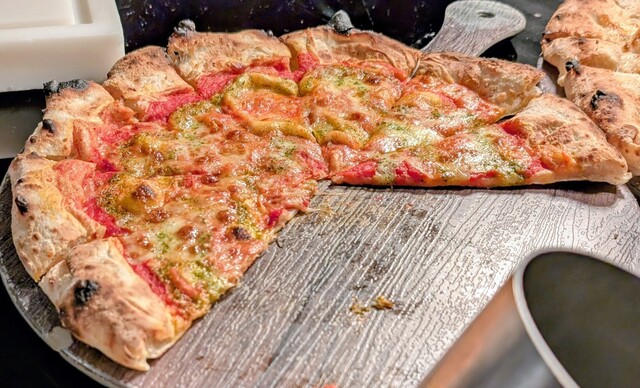 トマトとチーズ バジルのピザ、きのことブルーチーズのピザ