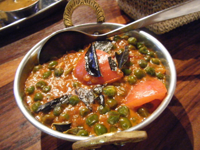 玉ねぎ、トマト、スパイスとソテーしたグリンピースのカレー。
