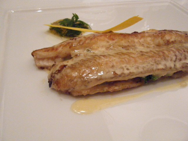 ○魚料理:白ゴーヤ、実山椒、ハスイモを挟んだ舌平目のムニエル 菜の花マスタード風味の白ワインソース