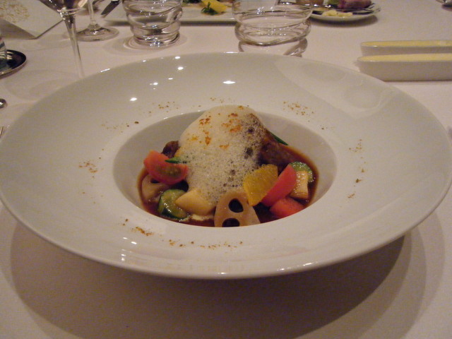 ○スープ:オマール海老のコンソメゼリー 温泉卵、ハス、青梅を浮かべて