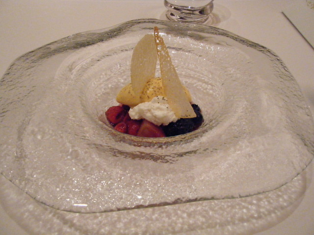 ○デザート:赤いフルーツの赤ワインマリネ 黒コショウ風味のバニラアイスクリームとシェーヴル・チーズを添えて