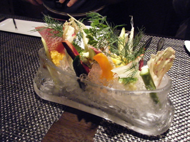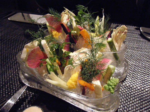 様々な野菜類が氷の上に刺さっておりフラワーアレンジメントのよう。