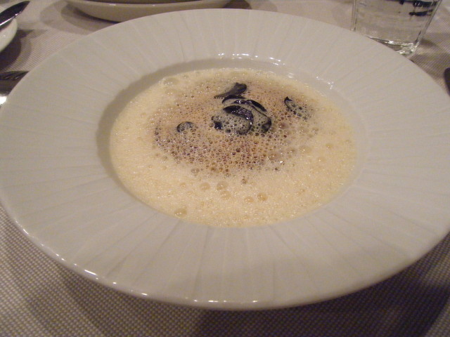最初の前菜は、美しい白い泡に包まれた、ジャガイモのクレープ。