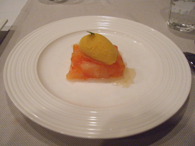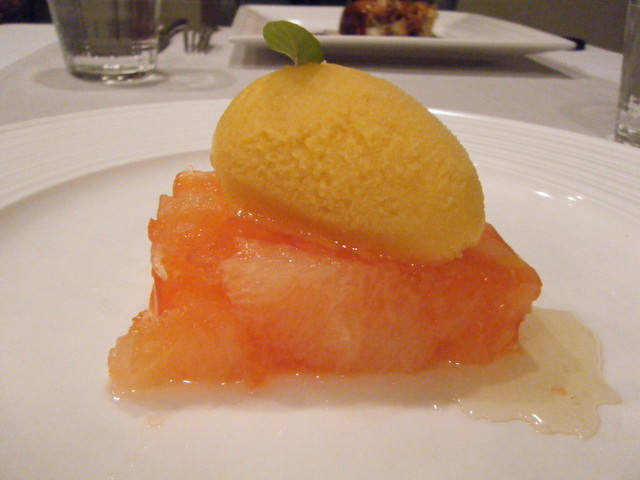 ○二色のグレープフルーツのカンパリゼリー寄せ 蜂蜜風味 マンゴーソルベ(600円)