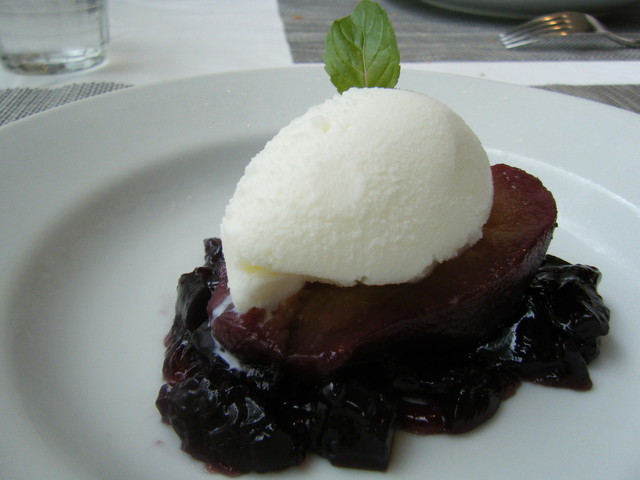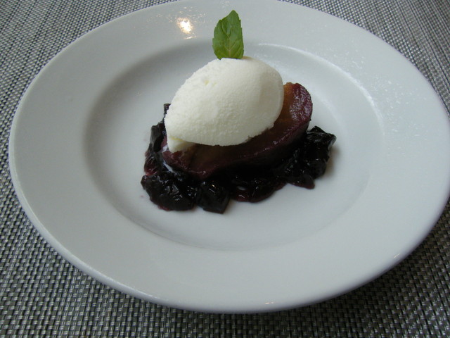 洋ナシの赤ワインコンポート ボジョレー風 煮汁のジュレと牛乳アイス