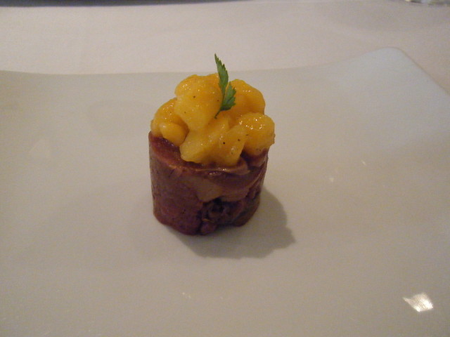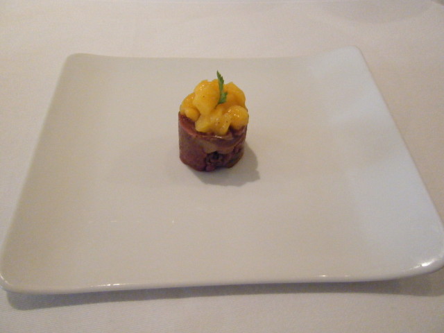 最初のアミューズは赤い小さな前菜。